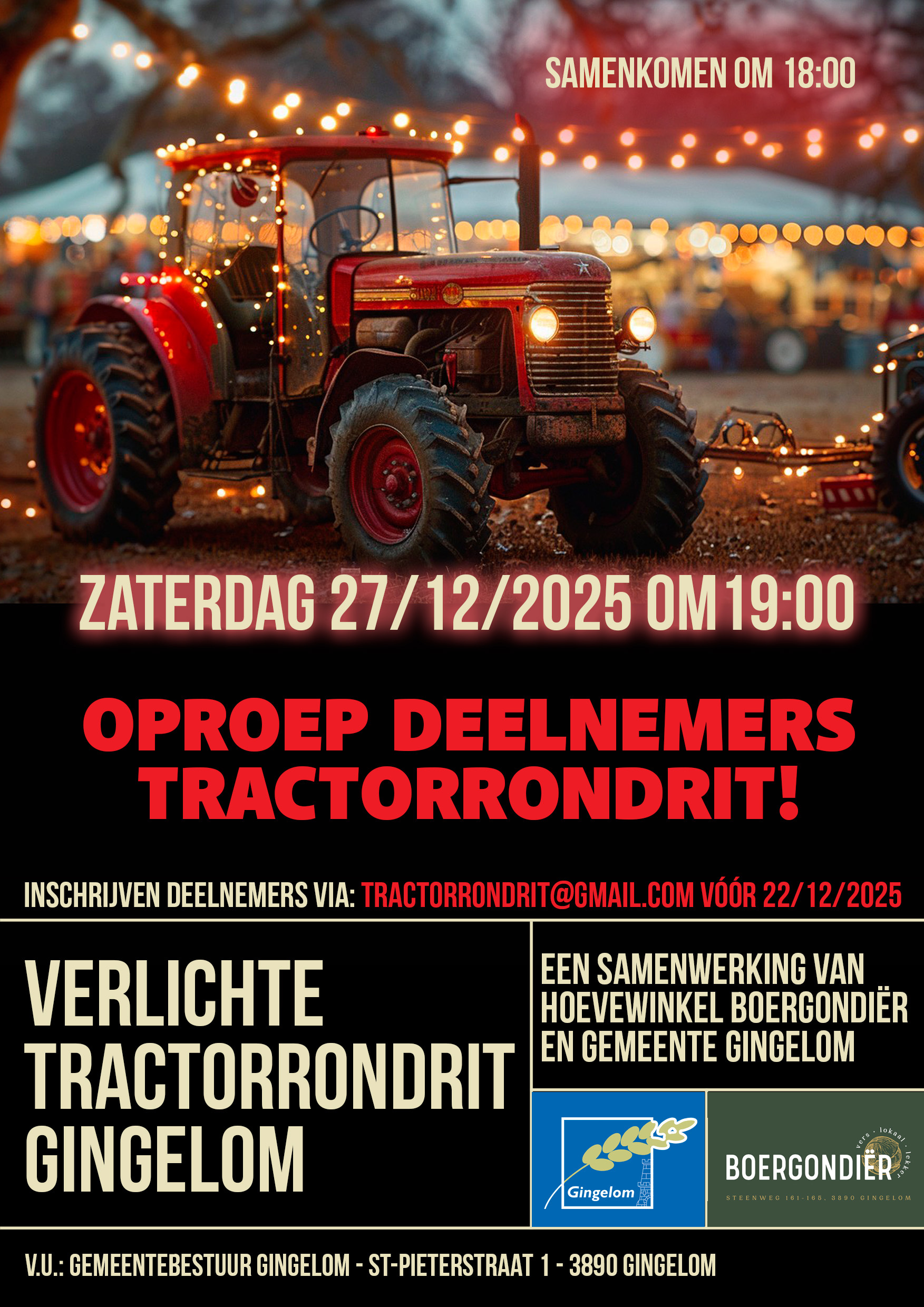 Op zaterdag 27/12/2025 dompelen we Gingelom onder in een magische eindejaarssfeer tijdens de Verlichte Tractorrondrit.